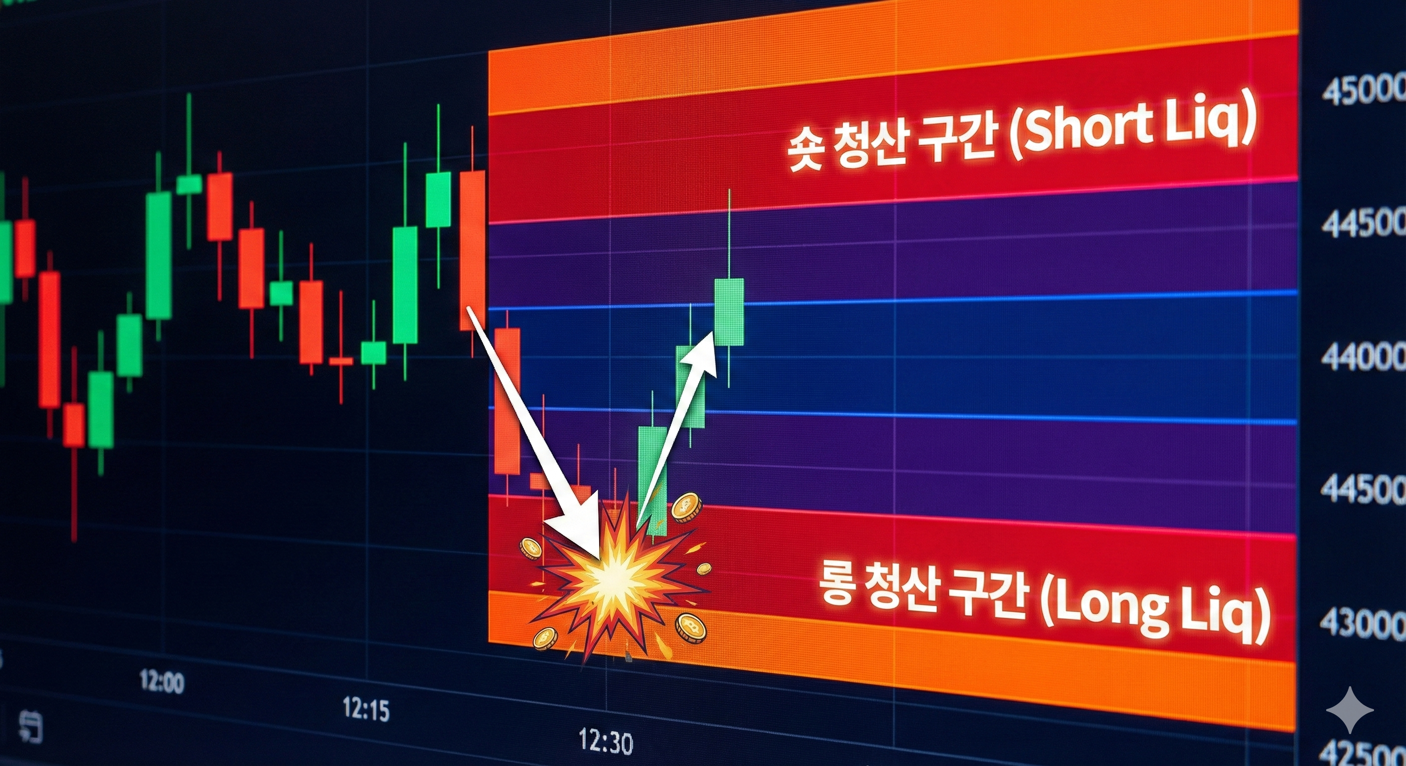 여러분이 롱 포지션을 잡고 특정 가격에 손절(Stop Loss)을 걸어두었다면, 그 가격에 도달했을 때 '매도' 주문이 나갑니다. 반대로 숏 포지션의 청산은 강제 '매수'를 의미합니다. 즉, 청산이 몰려 있는 곳은 엄청난 거래량이 터지는 곳입니다.
